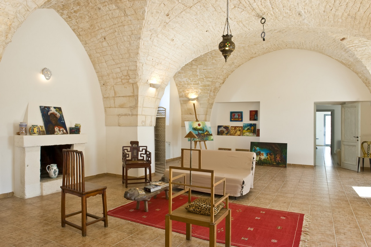 Attorno a un’aia centrale, si affacciano i due appartamenti Villa Fico e Villa Ulivo, il Salone esposizione d'Arte permanente, l’alcova, le antiche mangiatoie e l’ ampio parcheggio. L’area barbecue è situata vicino la piscina a sfioro, ad uso esclusivo dei nostri ospiti (delle due ville). La masseria nel cuore della valle d’Itria, in zona collinare (300 mt lm) a soli 20 minuti in auto dal mare.